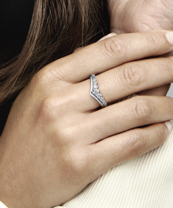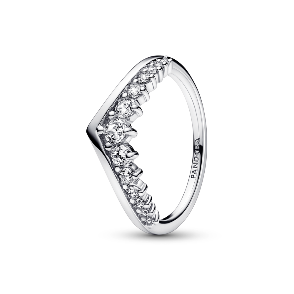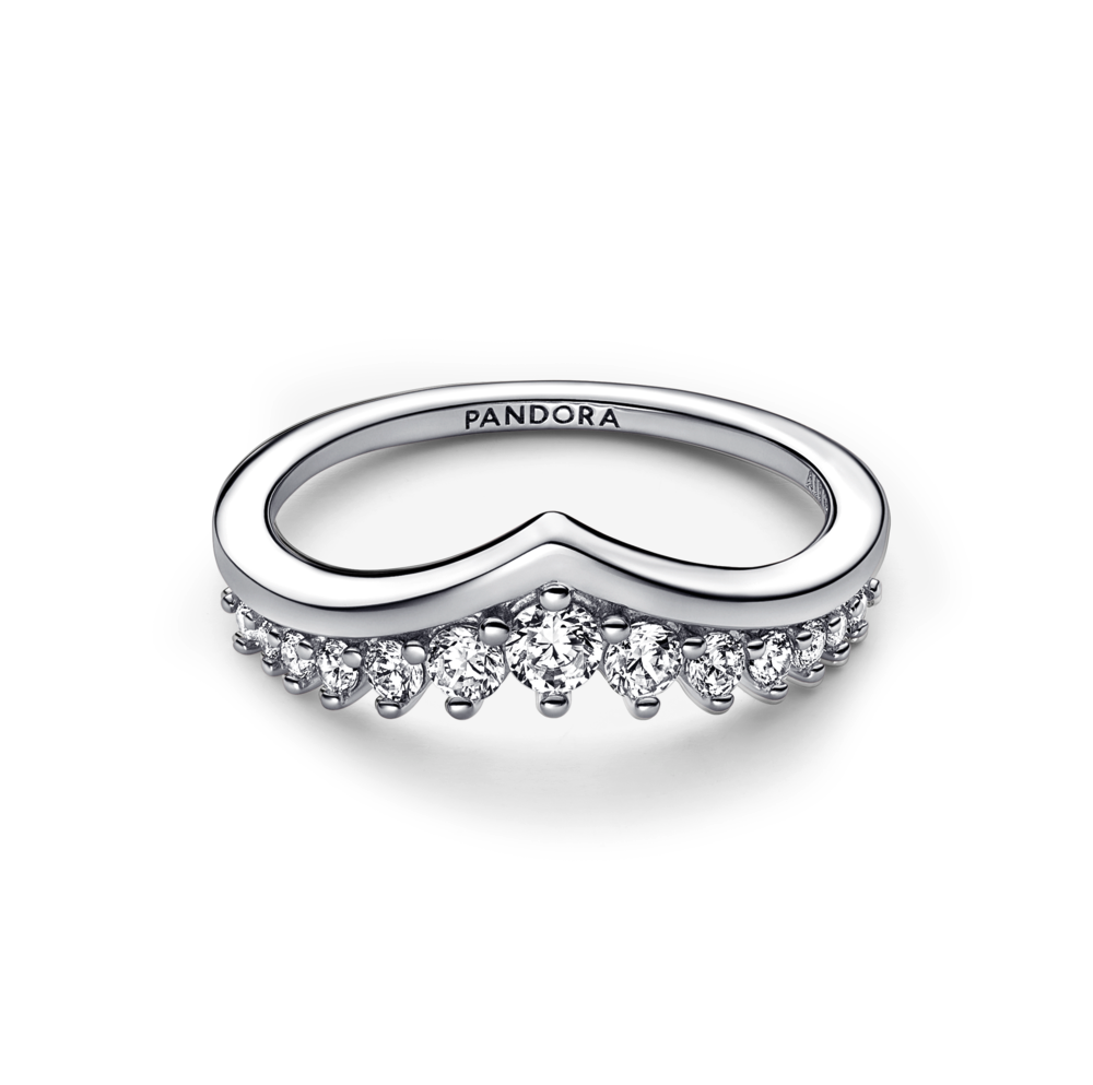 Let the past inspire your style with this Pandora Timeless Wish Floating Pavé Ring. a modern interpretation of classic ring styles. Crafted from polished sterling silver. the ring band is set to sparkle with a row of pavé underneath the arch of the wishbone. graduating in size to create a shining statement fit for any stack. Wear yours as a single piece or layer with more sparkling Pandora Timeless rings for a modern approach to stacking that will never go out of style.