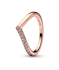 Make all your wishes come true with this delicate Sparkling Wishbone Ring. half-lined with 12 claw-set round brilliant-cut cubic zirconia stones on a 14k rose gold-plated band. Simple yet elegant. this wishbone-shaped ring can be worn on its own as a shimmering statement. or paired with other Pandora stackable rings to create a unique. highly individual look.