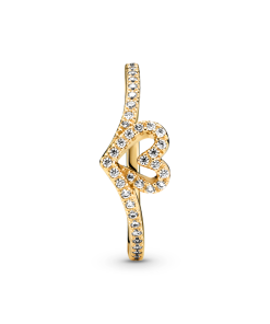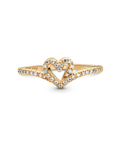 Surprise the one you love with our Sparkling Wishbone Heart Ring. Hand-finished in 14k gold plating. this piece is inspired by classic Pandora design elements. The heart detail has been incorporated into our iconic V-shape. creating a design ready to be adored. Clear cubic zirconia decorate the heart and top of the ring band. Present this style to someone special to show how much you care.