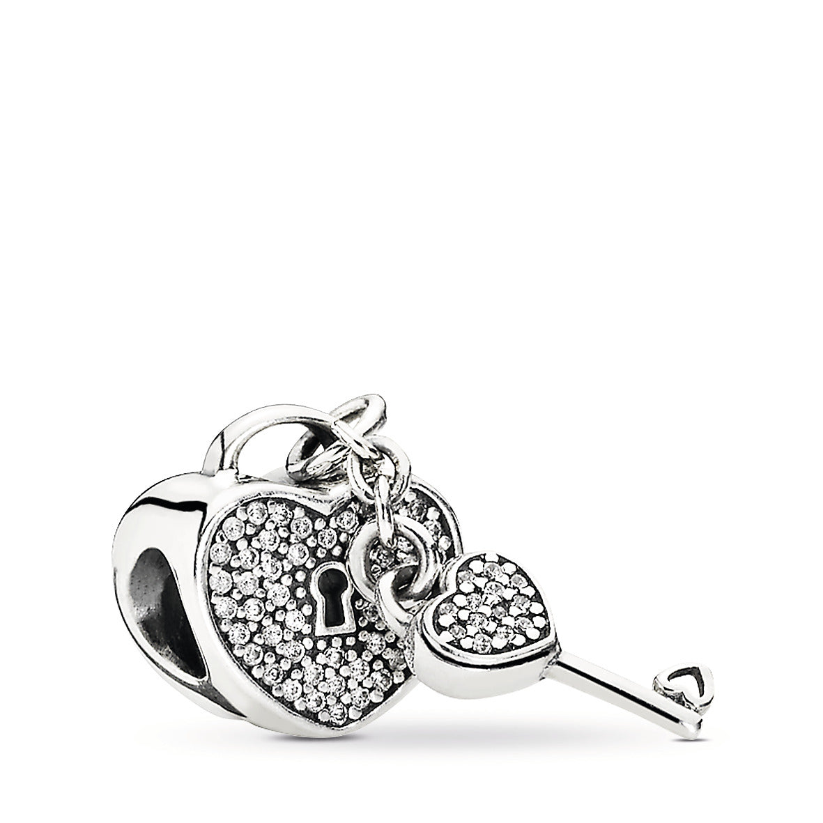 Create a look inspired by the love in your life with this sterling silver charm shaped as a heart padlock and set with 100 glittering cubic zirconia that provide the perfect amount of sparkle. The charm features a miniature stone-studded key dangle that symbolises the key to love. The sparkling charm threads effortlessly onto your favourite Pandora Moments bracelets and bangles and can even be worn as a necklace pendant.