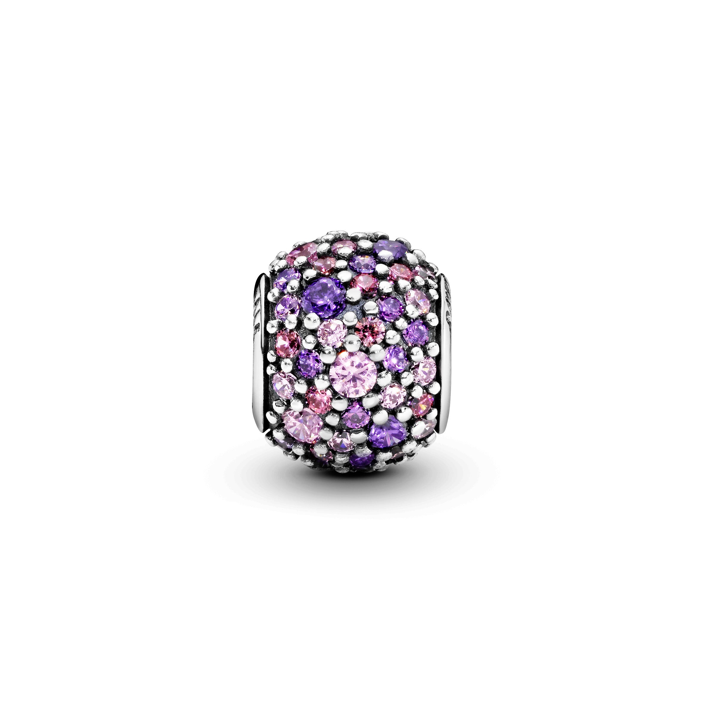 Our pavé ball charm lends luxe edge to your Pandora Moments bracelet thanks to its combination of carefully set stones and precious metal. Made from sterling silver. the round style is set with a multitude of glittering cubic zirconia in tonal pink and purple hues. Wear it as part of your story together with other charms that represent the things you love.