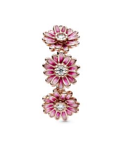 Bring flower power to your style with this flower crown-inspired Pink Daisy Flower Trio Ring. The daisy band ring is finished in Pandora Rose. 14k rose gold-plated unique metal blend and features three enamel flowers with cubic zirconia in the centre. The hand-painted finish brings the vibrant petals to life with delicate shading. Inspired by the daisy. a flower which blooms in adversity and represents freedom. the ring serves as a stylish reminder to stay true to who you are.