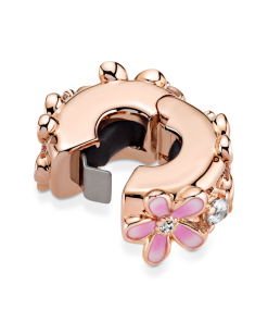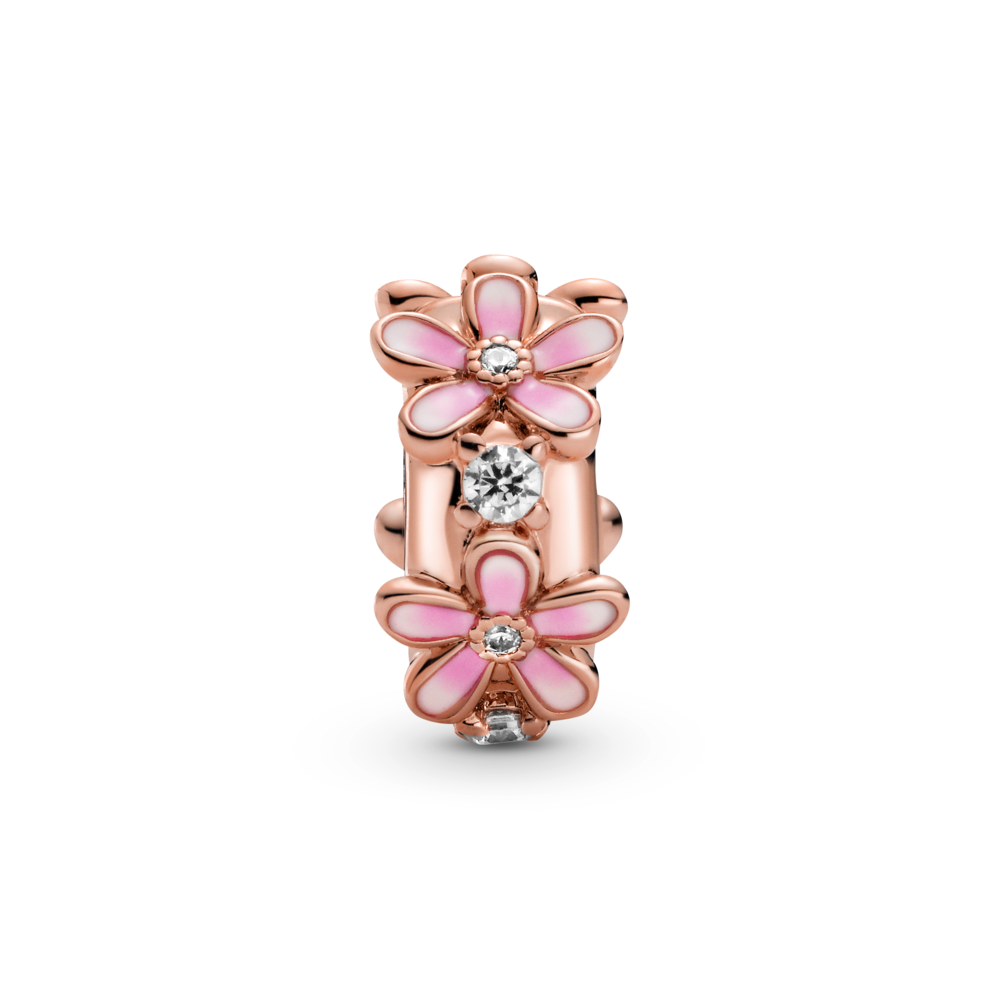 Clip on some color with the Pink Daisy Spacer Charm. Featuring sparkling clear cubic zirconia and transparent raspberry pink and white enamel. this warm-toned charm is hand-finished in Pandora Rose (14k rose gold-plated unique metal blend). The daisies. which represent diversity and community. have subtle dark-to-light enamel shading on the petals and miniature stones in the centre. With silicone on the inside. this flower charm is designed to be styled in a fixed position on snake chain styles.