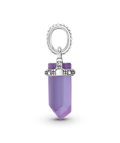 Tap into your inner magic with the Purple Amulet Pendant. Hand-finished in sterling silver. this design features a crystal-shaped frosted purple stone with a pointed edge. The stone is encircled by a girdle decorated with stars and microbeading features on the bail for added detail. Wear this pendant with a bracelet carrying charms that represent positive vibes and good fortune as a celebration of your unique power.