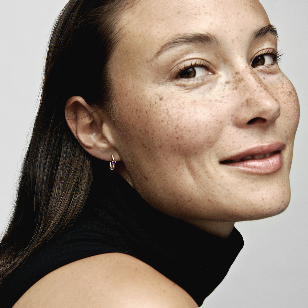 Let your ears do the talking with these Purple Solitaire Huggie Hoop Earrings. Hand-finished in Pandora Rose (14k rose gold-plated unique metal blend). each hoop features a royal purple stone. Style these earrings with colourful stone-embellished rings for a look that’s bursting with personality. If subtlety is more your vibe. team them with a staple bangle in Pandora Rose for just a hint of purple.