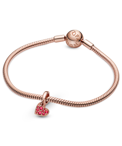 Add a pop of colour to your look with the Red Pavé Tilted Heart Dangle Charm. Hand-finished in Pandora Rose (14k rose gold-plated unique metal blend). this titled heart-shaped design is decorated with different-sized red cubic zirconia on the front. The polished back side includes cut-out circles and hearts. Style with sterling silver charms on your favourite bracelet to make this piece stand out or team with other colourful symbols for a vibrant finish.