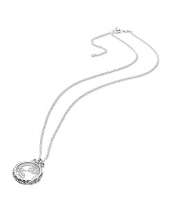 MaInspired by traditional Victorian locket pendants. this sterling silver necklace is shaped from colourless synthetic sapphire windows that display tonal pink and purple stones within. The swirling frame lends depth and dimension to the design – and a regal touch perfect for any style queen. It’s fitted with a slider clasp for the perfect fit.terial: Sterling silver