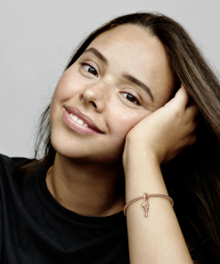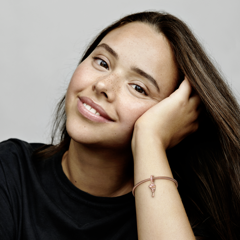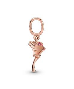 Prove that love knows no bounds with the Rose Flower Dangle Charm. Hand-finished in Pandora Rose (14k rose gold-plated unique metal blend). this flower-shaped dangle with detailed leaf is inspired by William Shakespeare’s famous play Romeo & Juliet. Glittering red stones feature on the bail. while red and pink stones line the edges of the rose’s petals. The engraving on the side of the charm says. I’m yours. Express your feelings to your sweetheart with this statement charm.