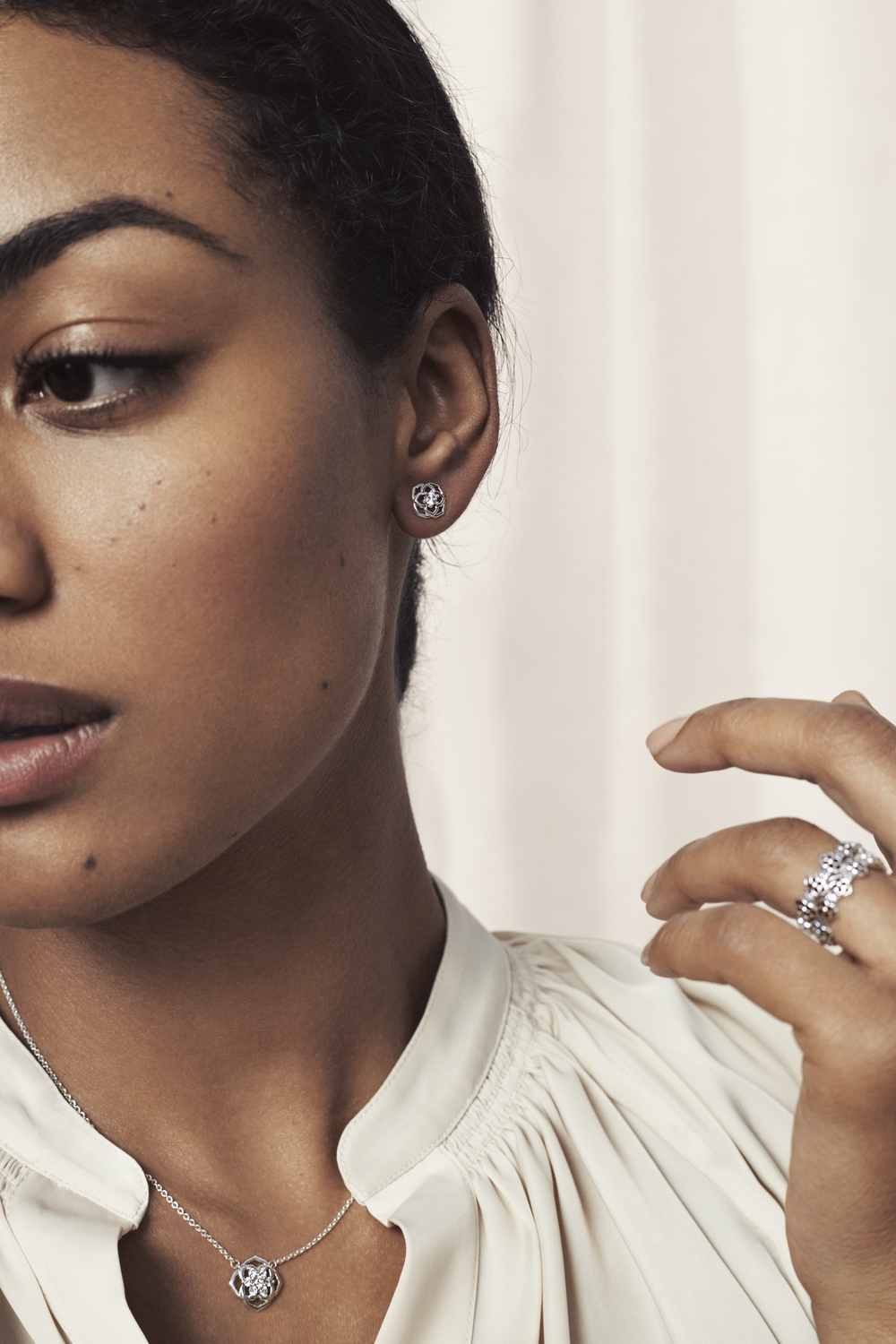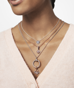 Upgrade your collection with the Rose Petals Collier Necklace. Hand-finished in sterling silver. this style includes a rose pendant with outlined petals on two different levels. Clear cubic zirconia are set in the shape of a flower at the centre of the pendant. A small rose outline dangles at the end of the adjustable chain while a Pandora logo tag features next to the clasp. Style this statement piece with other rose-themed designs for a classic. unified look.