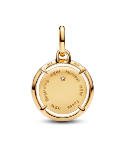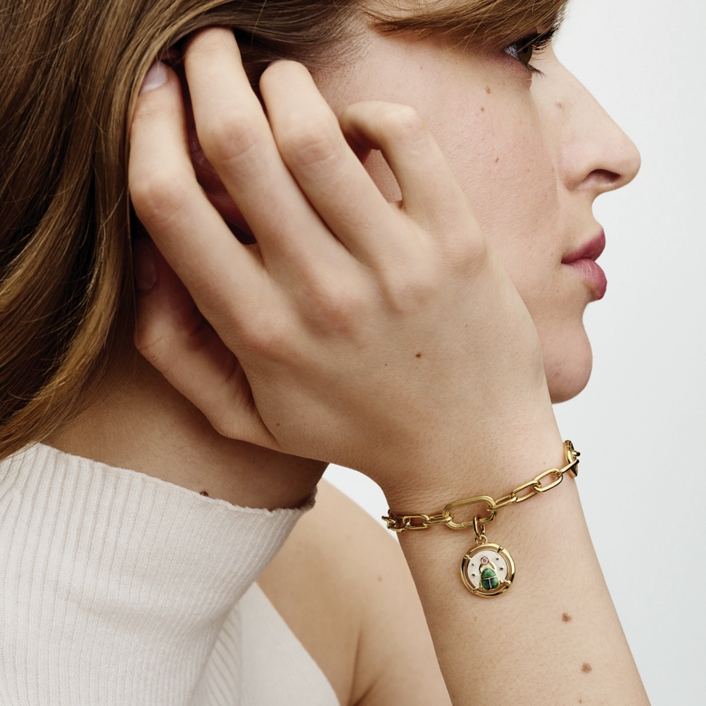 Scarab 14k gold-plated medallion with pink cubic zirconia. shimmering white. shaded blue and green enamel