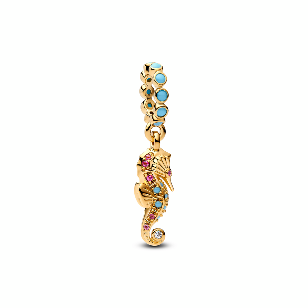 Seahorse 14k gold-plated dangle with clear cubic zirconia. capri blue crystal and phlox pink crystal