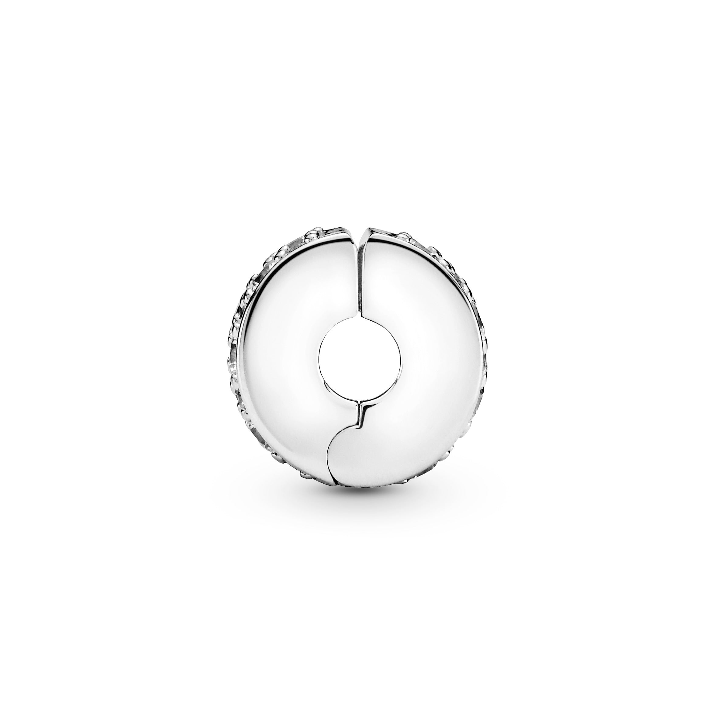 Add a touch of sparkle while securing your Pandora charms with this shimmering clip. crafted in sterling silver with cubic zirconia stones. A stylish way to complete your bracelet. Pandora clips can be used to create sections and feature a hidden silicone grip that keeps charms perfectly in place. This pavé style can be paired with Pandora bangles. snake chain necklaces and most bracelets.