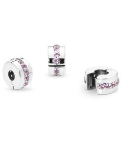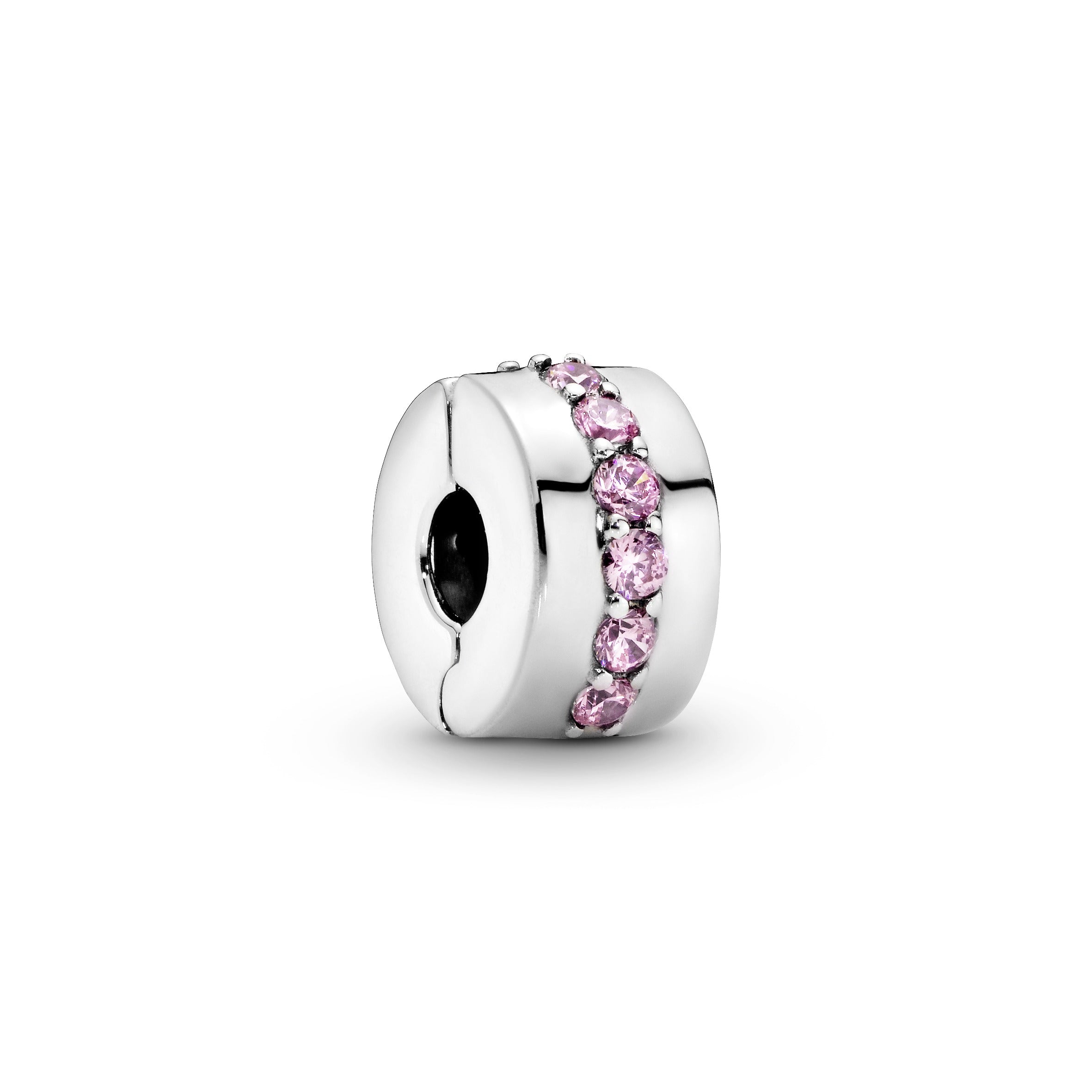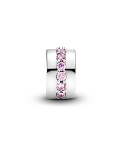 Our clip charms create balance on Pandora Moments bracelets. evenly spacing your adornments as well as adding decorative finish. This polished sterling silver design is carefully detailed by hand with a row of pink cubic zirconia. perfect for adding a splash of pink to your look. Mix and match with other favourites from the collection.