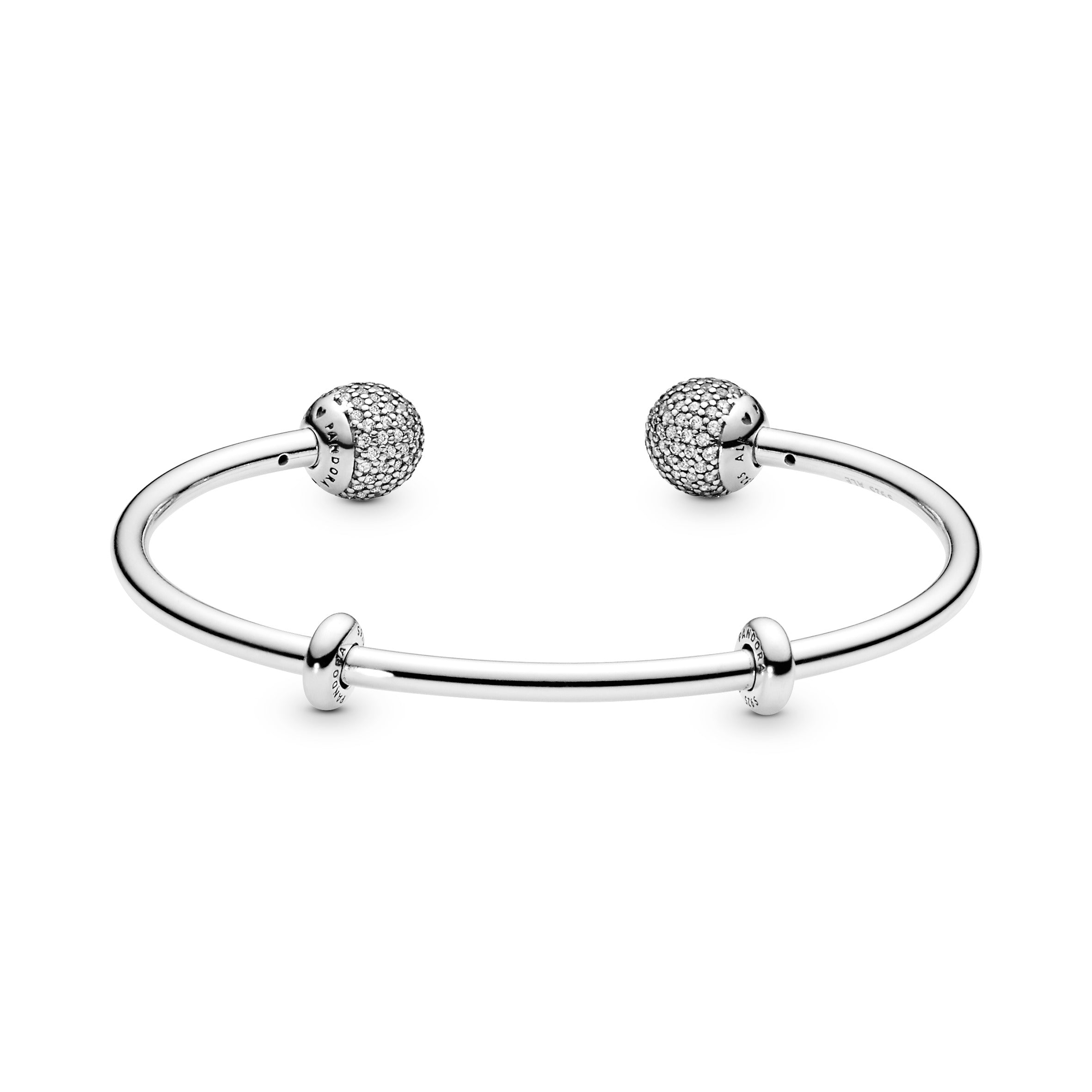 Sleek. signature styles are the foundation pieces of any jewellery look. Our Pandora Moments open bangle is made from sterling silver that’s been polished to a high-shine finish. The detachable end caps are pavé-set with cubic zirconia and two stoppers let you section your charms. Want to create your own arm party? Pile on bracelets and bangles. with or without charms. mixing metals. textures and sizes to create a look that’s uniquely you.