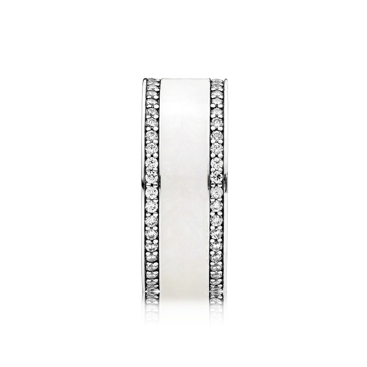 Make a soft yet bold statement with this wide hand-finished ring in sterling silver. Striking pearlescent enamel. lines of sparkling stones and cut-out hearts fuse minimalism with femininity.