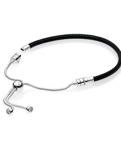 Give your look a little edge with this slider bracelet. A cool foundation for your personal edit of charms. the black leather style is finished with a sterling silver slider clasp for the perfect fit. Trimmed with end caps set with cubic zirconia. the sleek bracelet looks equally chic worn alone or layered in a stack of contrasting styles.