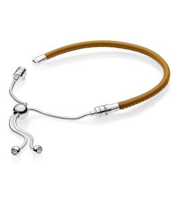 Go boho with this golden tan leather charm bracelet. finished with an adjustable slider clasp for the perfect fit. Interchangeable end caps are pretty. yet practical. and let you create unique looks to suit your mood. It’s made for Pandora Moments charms. but looks equally cool worn without. as part of a layered look.