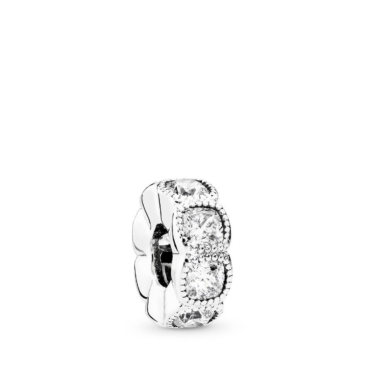 With a dazzling circle of cushion-cut stones encased in gleaming sterling silver. this sparkling spacer by PANDORA will enhance your bracelet styling with its timeless geometric look.
