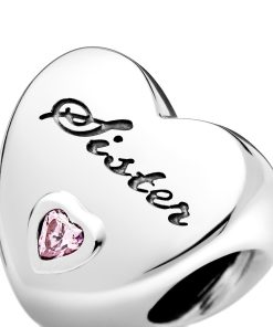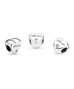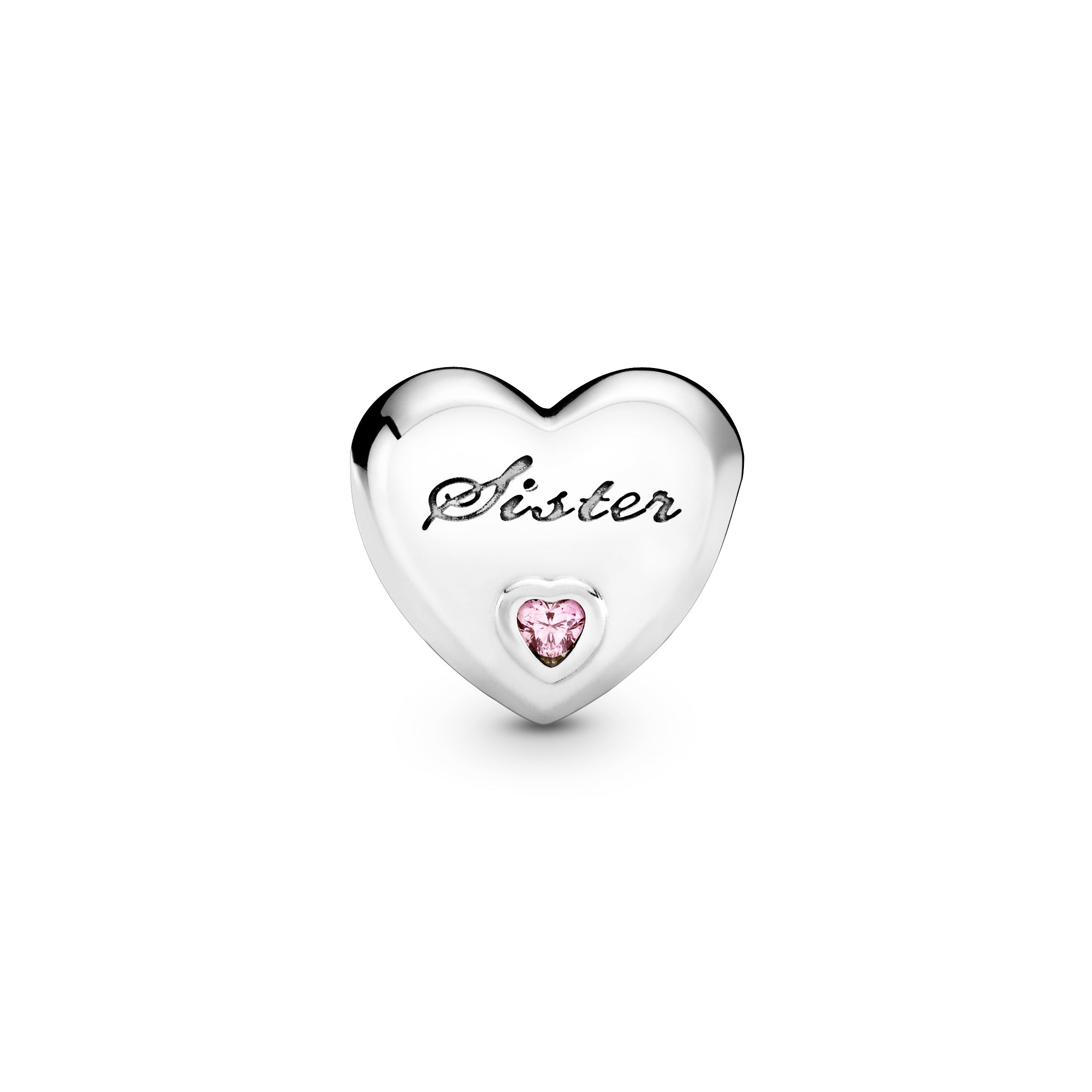 Pandora Moments charms are made for you to express the things you love – something. somewhere or someone. Made to celebrate the bond between siblings. our sterling silver family charm is shaped as a heart. Polished to a high shine. the simple yet meaningful style is trimmed with heart-shaped pink stones and the engraving Sister. We think it makes a meaningful gift to show the story you share.