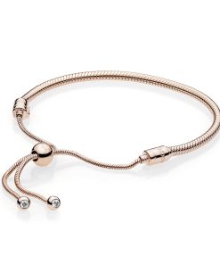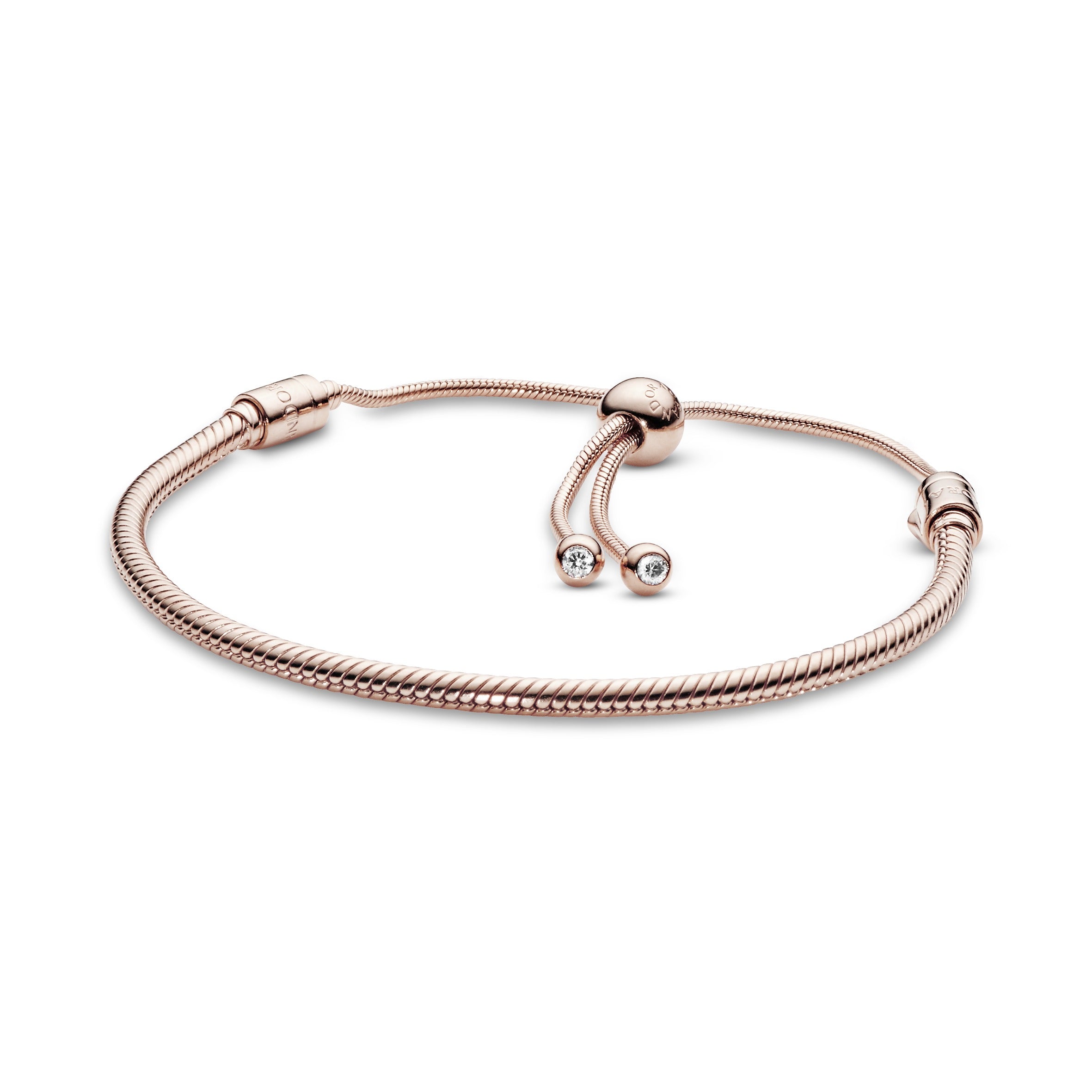 This stunning snake chain bracelet is a sophisticated spin on the classic friendship bracelet. Hand-finished in Pandora Rose – a 14k rose gold-plated unique metal blend – it features interchangeable end caps set with shimmering stones and an innovative sliding clasp that makes it easy to adjust. The perfect present for friends and loved ones. it can be worn as it is or filled with your favourite Pandora charms. The lobster clasp and jump ring are made from sterling silver plated with 14k rose gold.