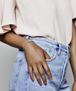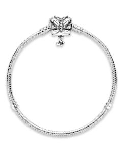 Make nature a part of your look with this butterfly bracelet. Part of our Pandora Moments collection. the classic sterling silver snake chain bracelet is updated with a butterfly clasp. The decorative closure is accented with sparkling clear cubic zirconia and features a dangling miniature butterfly that lends movement to your look. Wear it with styled with the charms that mean something personal to you.