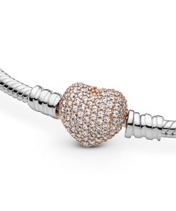 Put some love in your look with our classic Pandora Moments snake chain bracelet that’s been given a romantic update with a heart-shaped clasp in Pandora Rose. our unique metal blend plated with 14k rose gold. The pretty heart is detailed with cubic zirconia for a sparkling finish. The sterling silver style transitions effortlessly from day to night – and we think it looks equally elegant worn with or without charms. solo or stacked. Wear it to show more of the things you love.