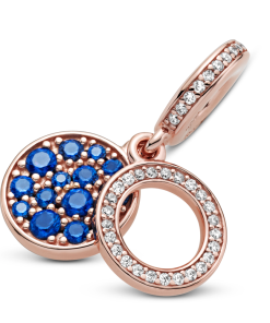 Introduce a pop of colour to your collection with the Sparkling Blue Disc Double Dangle Charm. Hand-finished in Pandora Rose (14k rose gold-plated unique metal blend). this design includes a back disc decorated with beading and stellar blue stones in various sizes. The Pandora logo and crown O monogram feature on the disc’s reverse side. The front circle includes clear cubic zirconia for added contrast. Style this piece with other colourful charms on your Pandora Moments bracelet for extra flair.