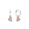 Get double the impact with the Sparkling Double Hoop Earrings. 14k rose gold-plated and hand-finished. these earrings feature two hoops with clear cubic zirconia pavé framed by micro-beading. The bottom hoop has cut-out hearts on the back side and the Pandora logo on its sides. The top hoop is attached to the bottom hoop at a perpendicular angle and the lower swings back and forth. creating eye-catching movement when you wear these statement earrings.