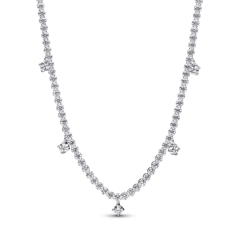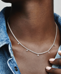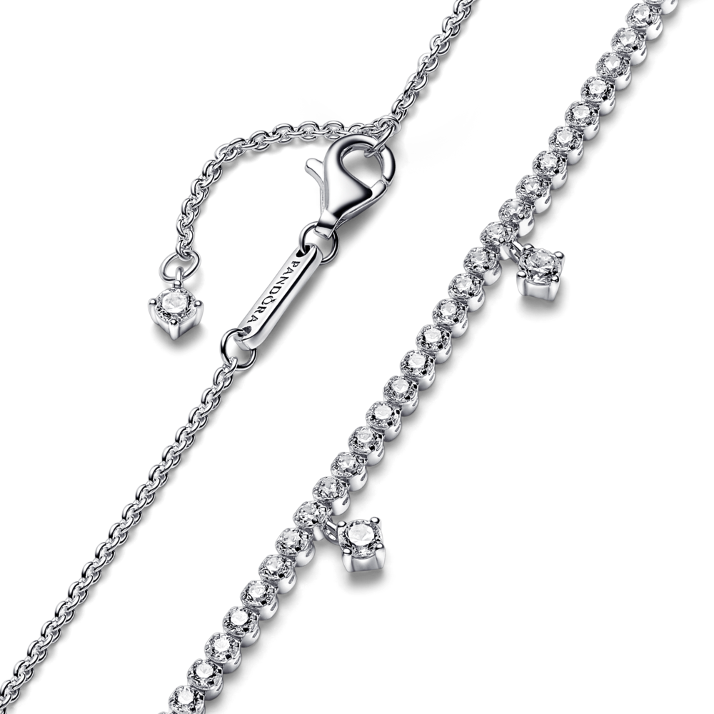 Sophisticated and elegant. this delicate Sparkling Drop Collier Necklace makes a classic statement with sparkling stones that never go out of style. Crafted from sterling silver. the necklace features sparkling clear cubic zirconia and is adjustable to three lengths. With a continuous row of pavé and larger singular stones dangling at intervals along the necklace. this piece is a modern twist on classic tennis bracelet silhouettes.