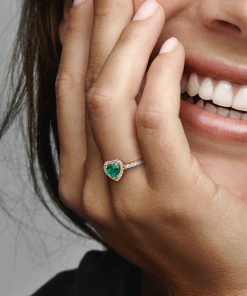 Add a sophisticated touch to your look with the Sparkling Elevated Heart Ring. The ring draws inspiration from the classic Pandora Timeless collection. Hand-finished in 14k rose gold unique metal blend. this piece features a green heart-shaped central. elevated stone. Clear cubic zirconia create the halo and decorate half of the ring band. with the Pandora logo inside the shank. Stack this ring with hand-finished styles in sterling silver for a statement mixed metal look.