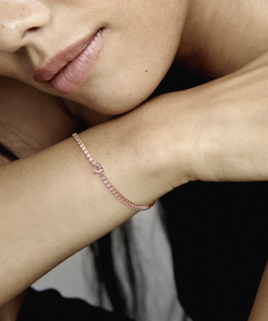 Bring elegance to your outfit with the Sparkling Pavé Tennis Bracelet. Hand-finished in our 14k rose gold-plated unique metal blend. this tennis bracelet is decorated with sparkling orchid pink man-made crystals. A large central heart-shaped stone punctuates a row of evenly sized pavé. The bracelet includes a lobster clasp for safe closure and can be adjusted to three lengths. Style it with other shimmering Pandora Timeless pieces for a classic look that stands out.