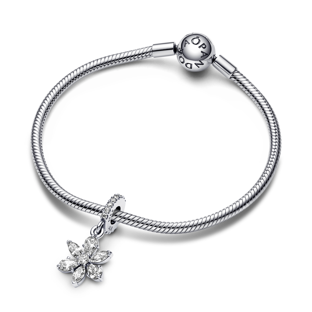 Bring the beauty of nature to your jewellery with the Sparkling Herbarium Cluster Dangle Charm. This sterling silver dangle charm features a cluster of alternating pear and marquise-shaped stones around a round centre stone. forming a geometric shape inspired by petal and leaf elements. An elegant reinterpretation of the shapes we find in nature. perfect to bring a delicate. floating feel to your bracelet. necklace or earrings.