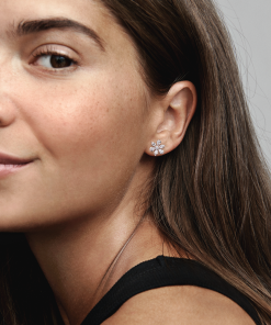 Bring the beauty of nature to your jewellery with our Sparkling Herbarium Cluster Stud Earrings. These 14k rose gold-plated studs feature a cluster of alternating pear and marquise-shaped stones around a round centre stone. forming a geometric shape inspired by petal and leaf elements. An elegant reinterpretation of the shapes we find in nature. these sparkling studs are perfect for bringing a delicate. floating feel to your everyday looks.