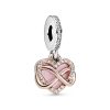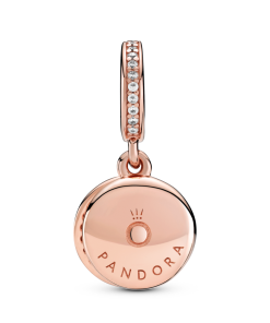 Introduce a pop of colour to your collection with the Sparkling Light Blue Disc Double Dangle Charm. Hand-finished in Pandora Rose (14k rose gold-plated unique metal blend). this design includes a back disc decorated with beading and aqua blue stones in various sizes. The Pandora logo and crown O monogram feature on the disc’s reverse side. The front circle includes clear cubic zirconia for added contrast. Style this piece with other colourful charms on your Pandora Moments bracelet for extra flair.