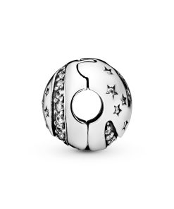 Capture the mystery of the universe with this clip charm in sterling silver. Letting you section and balance your bracelet. it’s set with cubic zirconia stars and a crescent moon in a lasting tribute to the night sky. The clip charm for Pandora Moments bracelets adds a little nighttime magic to daytime looks and keeps the mystery of the nights sky close to you.