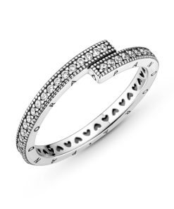 Opt for modern minimalism with the Sparkling Overlapping Ring. This Sterling Silver ring features an asymmetrical design where the square ends of the band slightly overlap to create 90-degree angles. The outer band features clear cubic zirconia pavé framed by micro-beading. the sides have the Pandora logo and the inner shank has cut-out hearts. There are two Pandora Crown O monograms at the end of each profile. Subtly stunning on its own or show-stopping when multiple are stacked together. this ring makes a clean. chic statement.