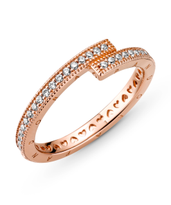 Opt for modern minimalism with the Sparkling Overlapping Ring. This hand-finished. 14k rose gold-plated ring features an asymmetrical design where the square ends of the band slightly overlap to create 90-degree angles. The outer band features clear cubic zirconia pavé framed by micro-beading. the sides have the Pandora logo and the inner shank has cut-out hearts. There are two Pandora Crown O monograms at the end of each profile. Subtly stunning on its own or show-stopping when multiple are stacked together. this ring makes a clean. chic statement.