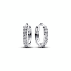 Sophisticated and elegant. these delicate Sparkling Pavé Bars Hoop Earrings dazzle. Hand-finished in sterling silver. the earrings feature a row of sparkling clear cubic zirconia pavé highlighted by five larger singular stones set at different heights. The pavé runs halfway around the outside and halfway around the inside of the hoop for full front-facing stone visibility and sparkle. Inspired by classic tennis bracelets. these timeless hoops will complement any look.