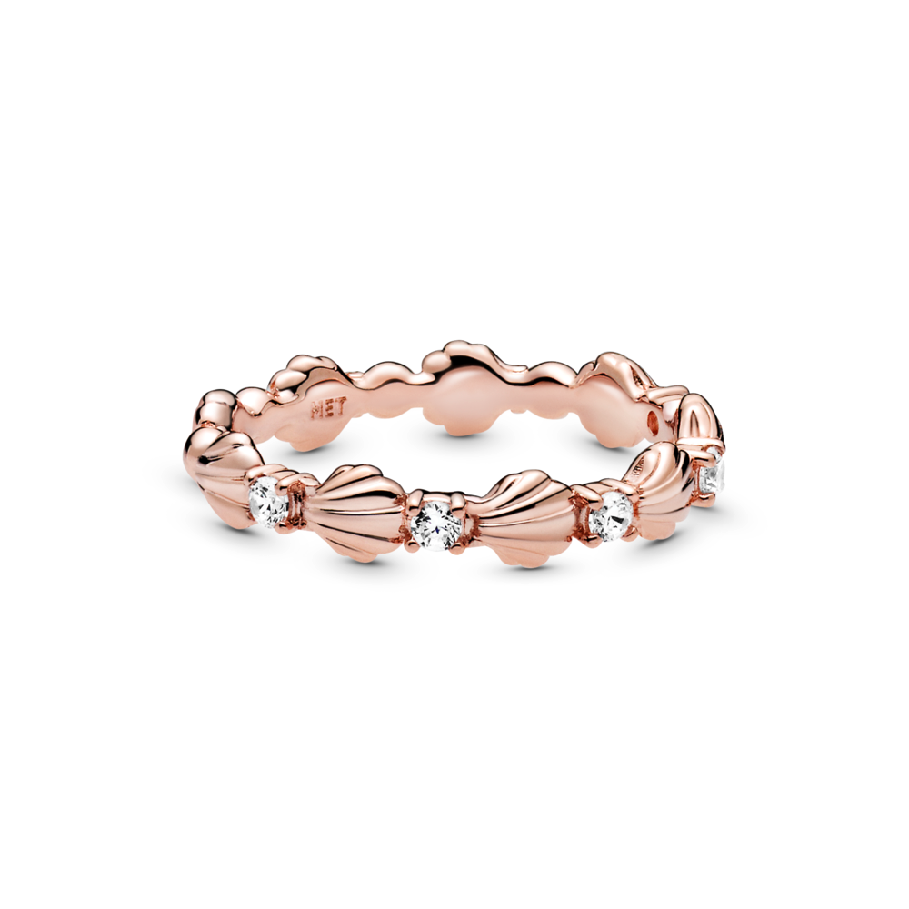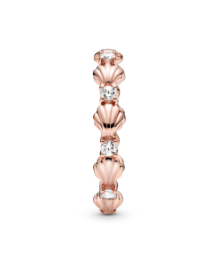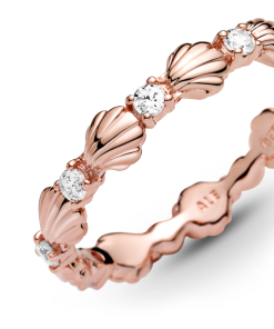 Add the mystery of treasures from the depths of the ocean to any outfit with this Sparkling Seashell Band Ring. Hand-finished in 14k rose gold plating. this seashell ring features five bead-set round brilliant cut clear cubic zirconia set on a line of shells. You can wear it by itself or with other ocean-themed band rings to put the finishing touches on any beach-inspired look.