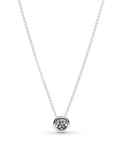 Welcome the holidays with the Sparkling Snowflake Collier Necklace. Hand-finished in sterling silver. this piece is inspired by the wonders of winter. The necklace features clear stones in the form of a star-like snowflake formation inside a circle decorated with clear cubic zirconia. One pear-shaped stone dangles from the end of the chain and a Pandora crown O monogram logo tag features by the clasp. Adjust to suit your style and wear with other shimmering pieces for a statement look.