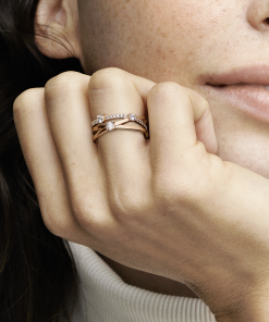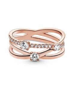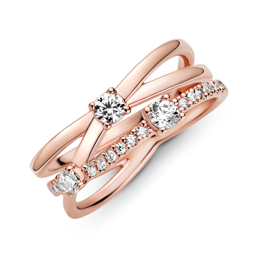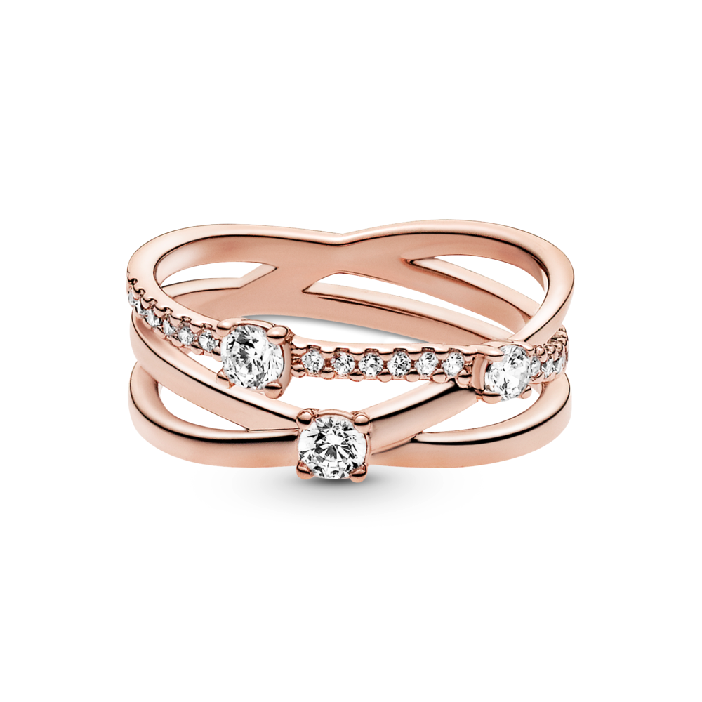 For a classic touch. go for the Sparkling Triple Band Ring. Hand-finished in 14k rose gold plating. this style features three interlinked rings. Small clear cubic zirconia decorate the top of one ring shank. while three bigger stones are set across all three for extra sparkle. As this wide-band ring has a pre-stacked look. teaming it with other shimmering Pandora Timeless rings will make a bold statement.