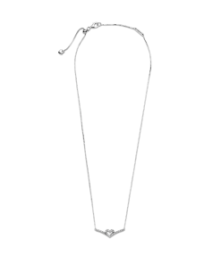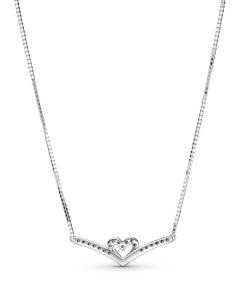 Express your love with the Sparkling Wishbone Heart Collier Necklace. Inspired by design elements from the Pandora Wish collection. this style is hand-finished in sterling silver. The iconic V-shape has been incorporated into the pendant’s sparkling heart detail to create a fluid design. Including a slider clasp for an adjustable fit. the design includes a small polished heart at the end of the chain. Gift to someone special to show you care.