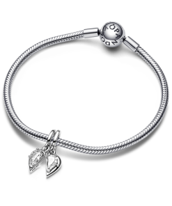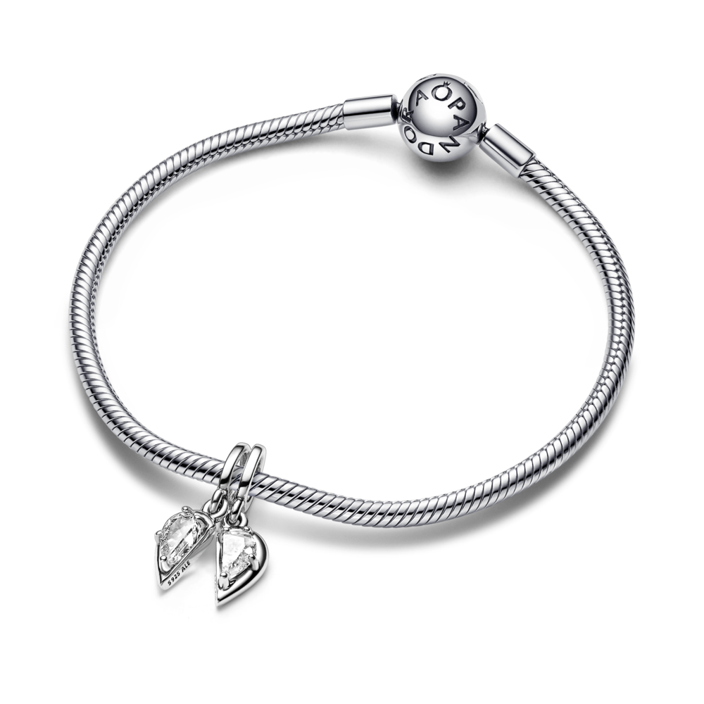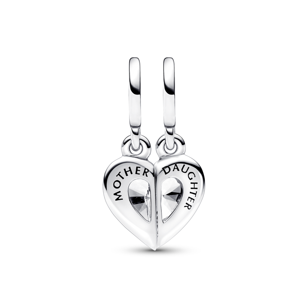 Metal: sterling silver Stone: 2 prong-set half heart-shaped faceted clear cubic zirconia Engraving: MOTHER; DAUGHTER Motif: heart-shaped splittable dangle charm with stone Special features: the heart-shaped stone is cut vertically in the middle to allow the charm to be splittable; the two pieces form a heart together; on the back of each piece a functional hole half heart-shaped for stone setting; the two half heartshaped holes form a heart together; both halves of the heart feature an engraved message; plain polished bail. Inspiration: I give you a piece of my heart – from mum to daughter or daughter to mum. Even though apart. the love between us is a strong unbreakable unity. Your mother will always be perfect to you. just as she is