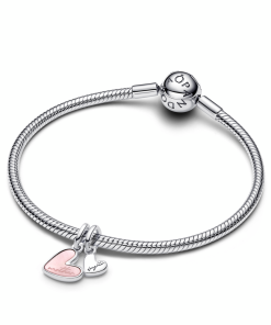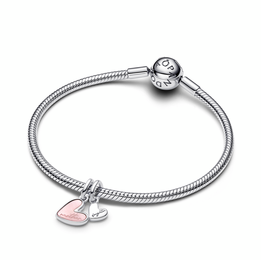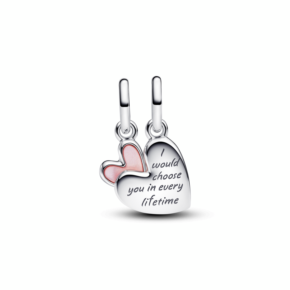 Mother and daughter hearts sterling silver splittable dangle with pink bioresin man-made mother of pearl