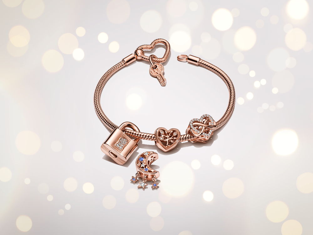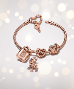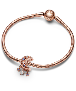 Add celestial sparkle to any look with the Star & Crescent Moon Charm. Finished in 14k rose gold plating. the charm has been carefully detailed by hand with rows of cubic zirconia and cut-out star and circle shapes. Microbeads decorate the edges and asymmetric stars with stones and microbeads dangle from the sides. The cosmic charm is engraved with the message Dream big to remind you to always reach for the stars.