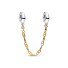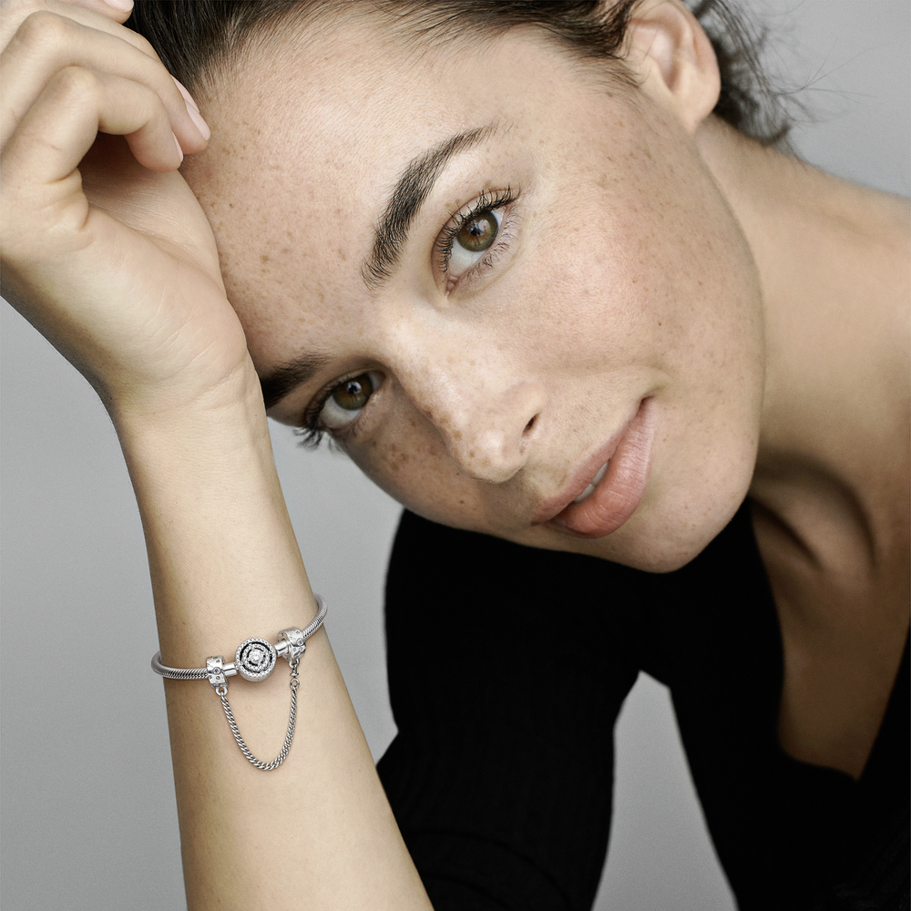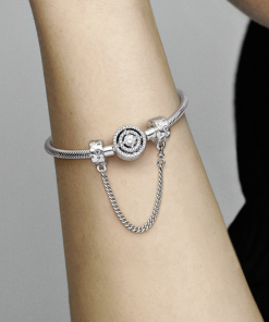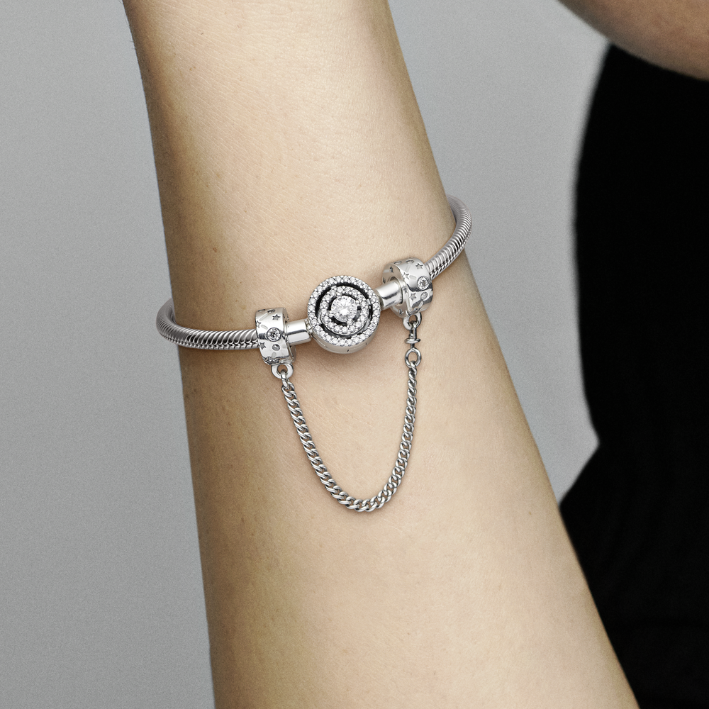 Keep your charm collection safely in place with our Stars & Galaxy Safety Chain charm. The sterling silver safety chain charm attaches to each end of the openings of your bracelet to provide extra peace of mind. The clasps are embellished with engraved stars and sparkling cubic zirconia stones stones set in circle and star shapes. which are connected by shimmering silver white hand-applied enamel stripes. Combine style and safety in one celestial-inspired piece.