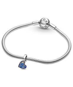 Add a pop of colour to your look with the Stellar Blue Pavé Tilted Heart Dangle Charm. Hand-finished in Pandora Rose (14k rose gold-plated unique metal blend). this titled heart-shaped design is decorated with different-sized blue crystals on the front. The polished back side includes cut-out circles and hearts. Style with sterling silver charms on your favourite bracelet to make this piece stand out or team with other colourful symbols for a vibrant finish.
