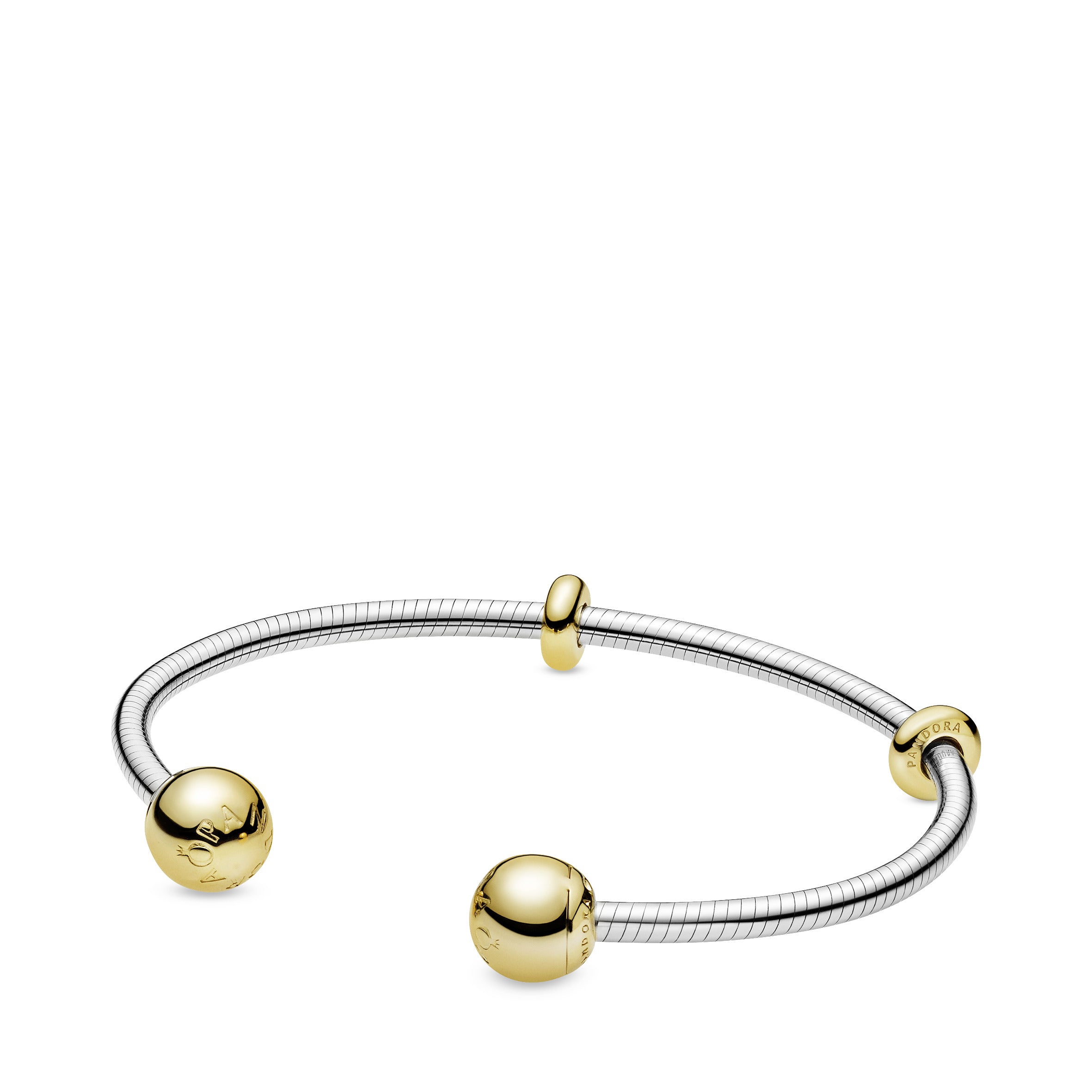 If you’re looking for a bangle that stands out from all others and gives you something special. look no further. This Pandora Moments Open Bangle with 14k Gold Plated (18k gold-plated sterling silver) silicone stoppers and interchangeable end caps is everything you’re looking for in a versatile bangle and more. The elegant open bangle features Pandora’s timeless and iconic snake chain look to instantly transform your style with its iconic design.