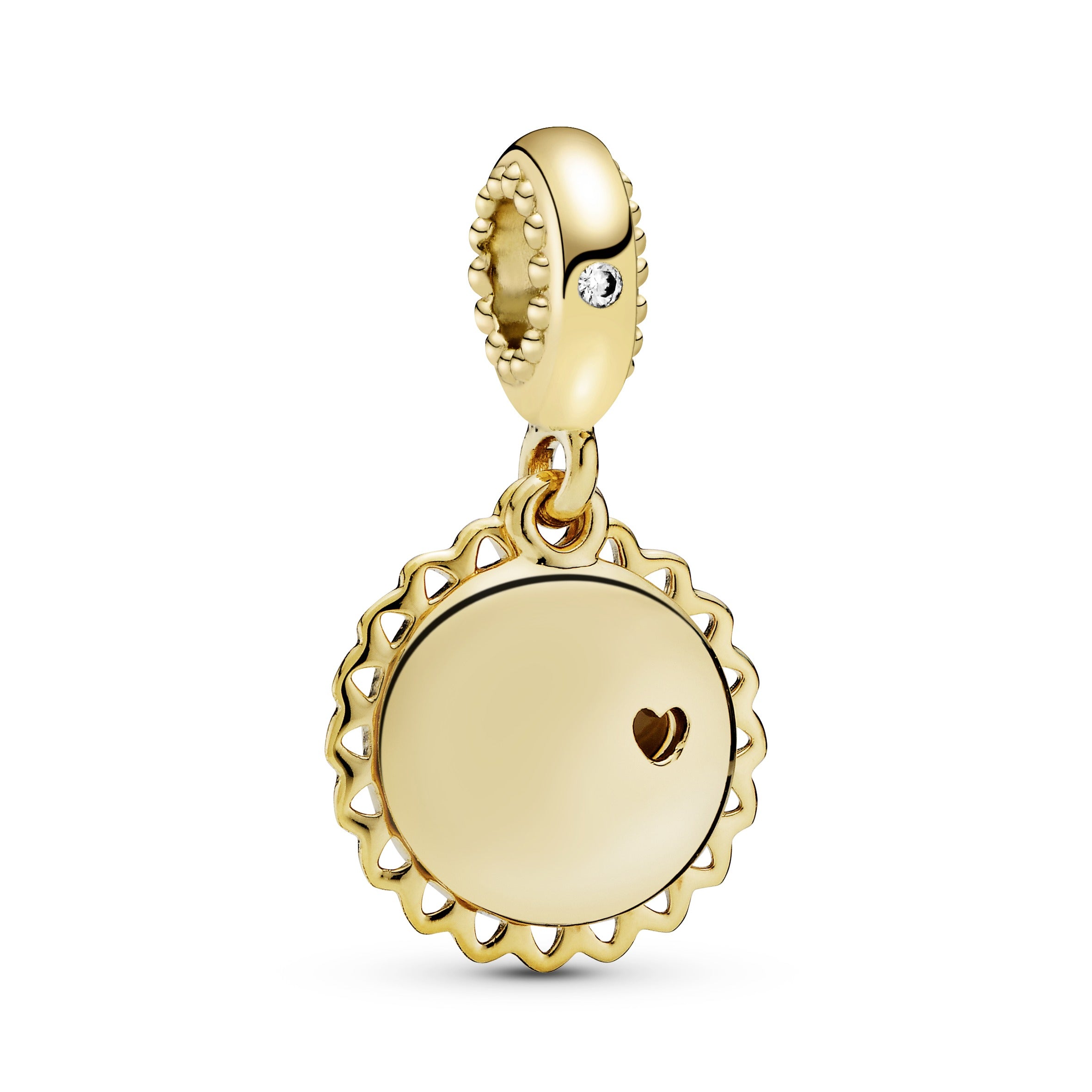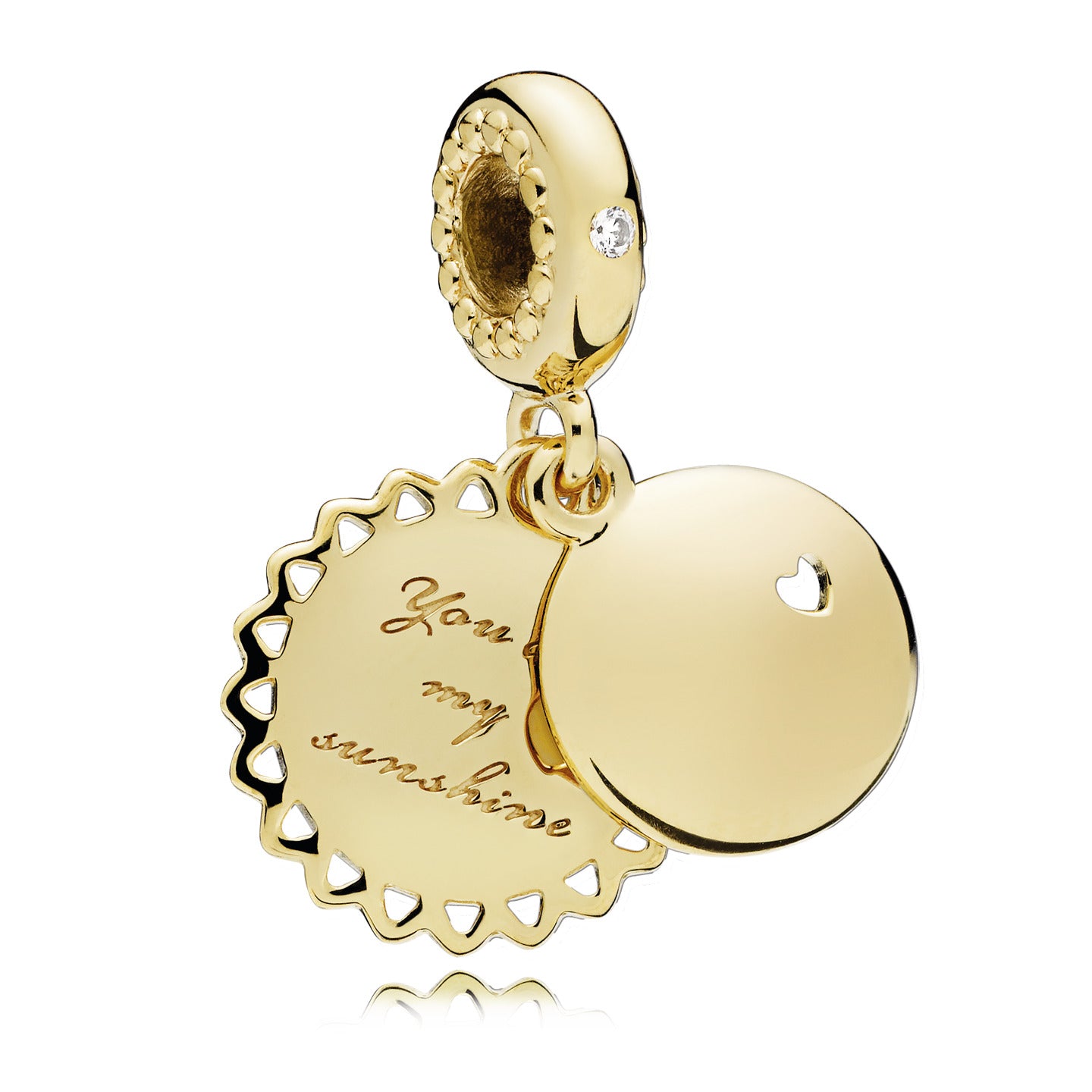 Show someone how much you appreciate their sunny disposition with this uplifting charm in 14k Gold Plated . our 18k gold-plated unique metal blend. The locket-inspired charm features two discs that join to create a sun. a symbol of joy and happiness. One features a yellow enamel heart and the engraving You are my sunshine and the other is decorated with a cut-out heart.