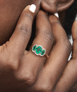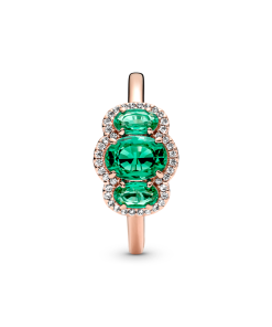 Elevate any look with the Three Stone Vintage Ring. Hand-finished in our 14k rose gold-plated unique metal blend. this ring is set with two oval cut green crystals on either side of a large oval green centre stone. A clear pavé halo frames the three stones. while a thin band and open sides on the basket holding the stones give the ring a delicate look. Wear it solo or stack it with other styles to make a statement.